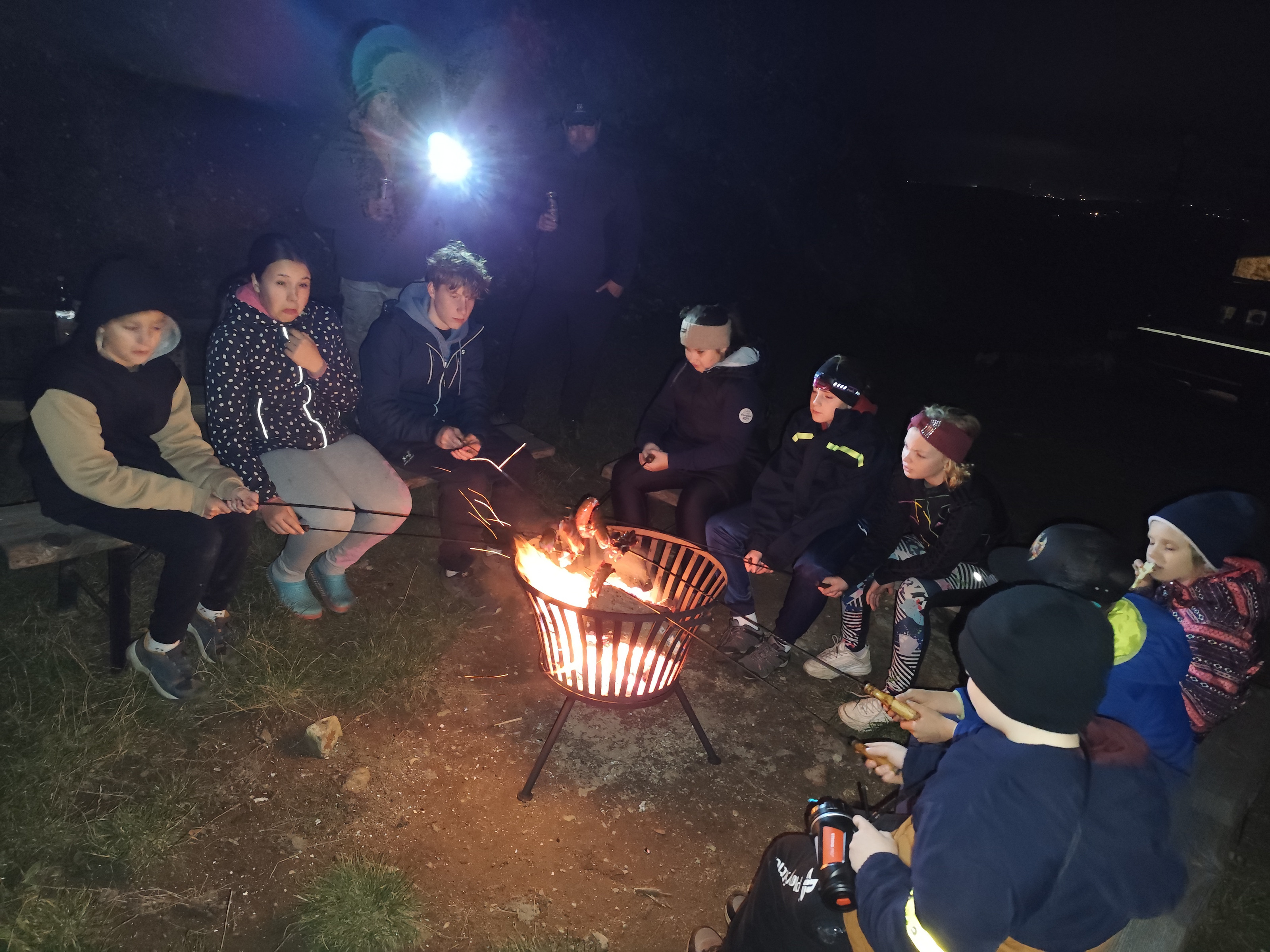 Když se blížila noc 🌙, nastal čas na zlatý hřeb večera – táborák přímo v areálu hradu 🔥. Vůně opékaných špekáčků 🌭, hraní na kytaru 🎸, a hromada zpěvu 🎶 a smíchu 😄. Pod hvězdnou oblohou 🌌 jsme si vyprávěli hororové příběhy 👻 a utužovali kamarádství. Přenocování na tak kouzelném místě bylo pro všechny obrovským zážitkem 🌟, na který budeme ještě dlouho vzpomínat.