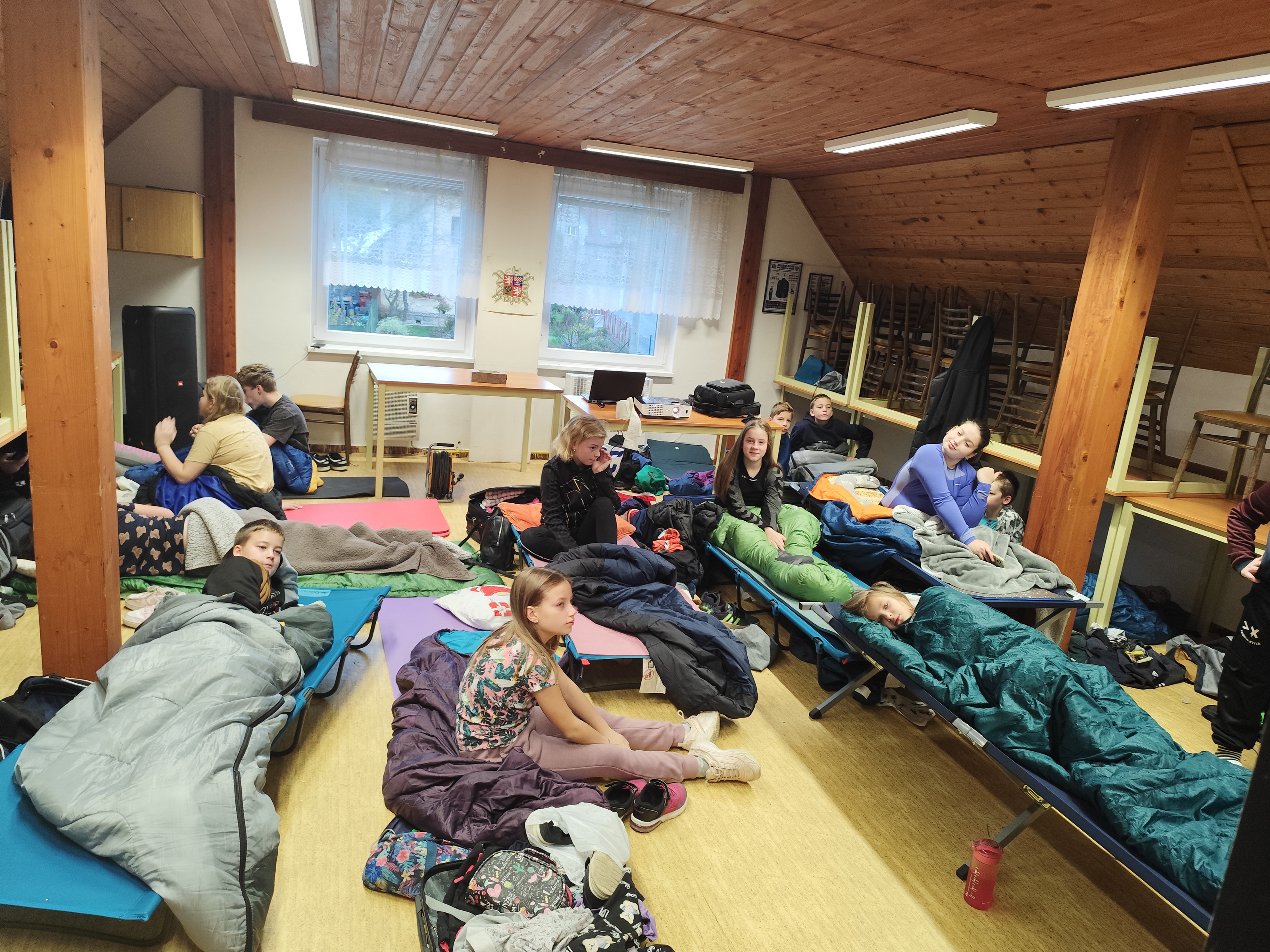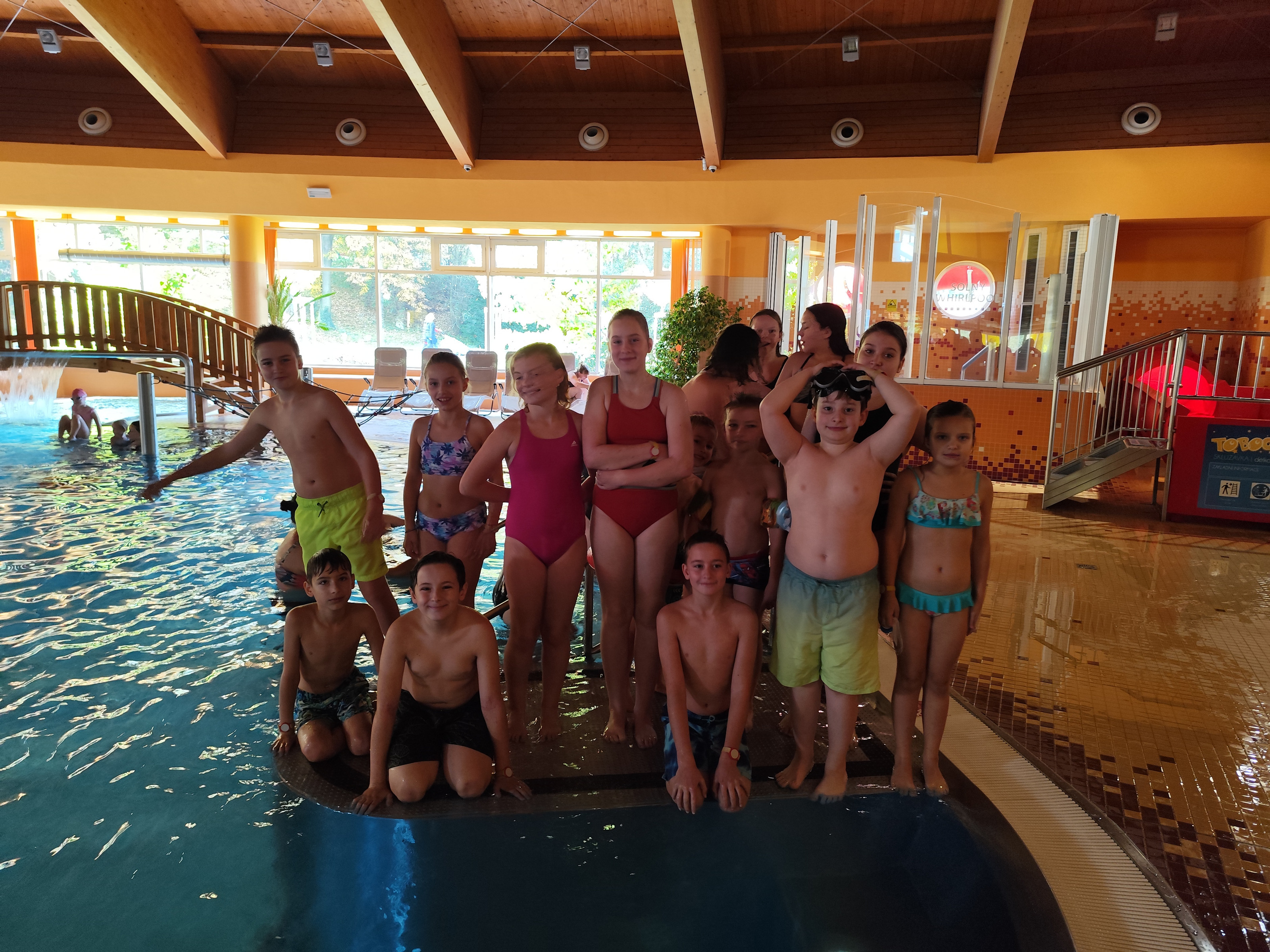 Po pohodové noci strávené na hasičárně jsme se ráno vydali na krytý bazén ve Valašském Meziříčí 🏊. Děti si užily vodní zábavu 💦, skluzavky 🛝, vířivku 💫. Bylo vidět, že vodní program je trefa do černého 🎯.