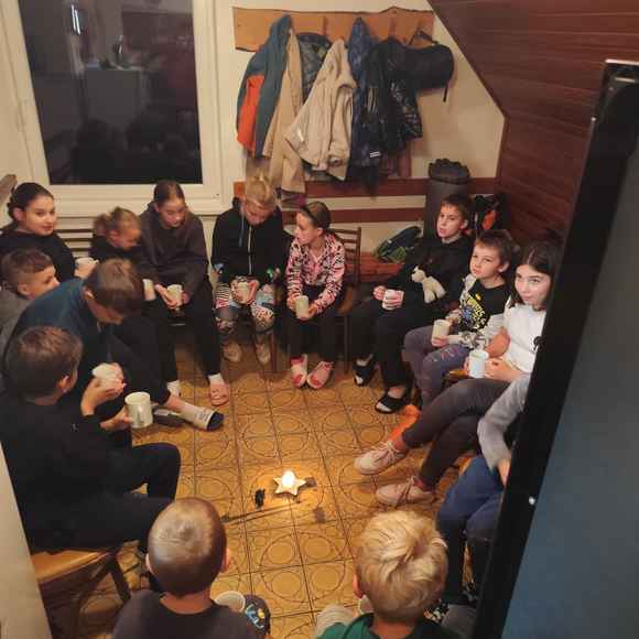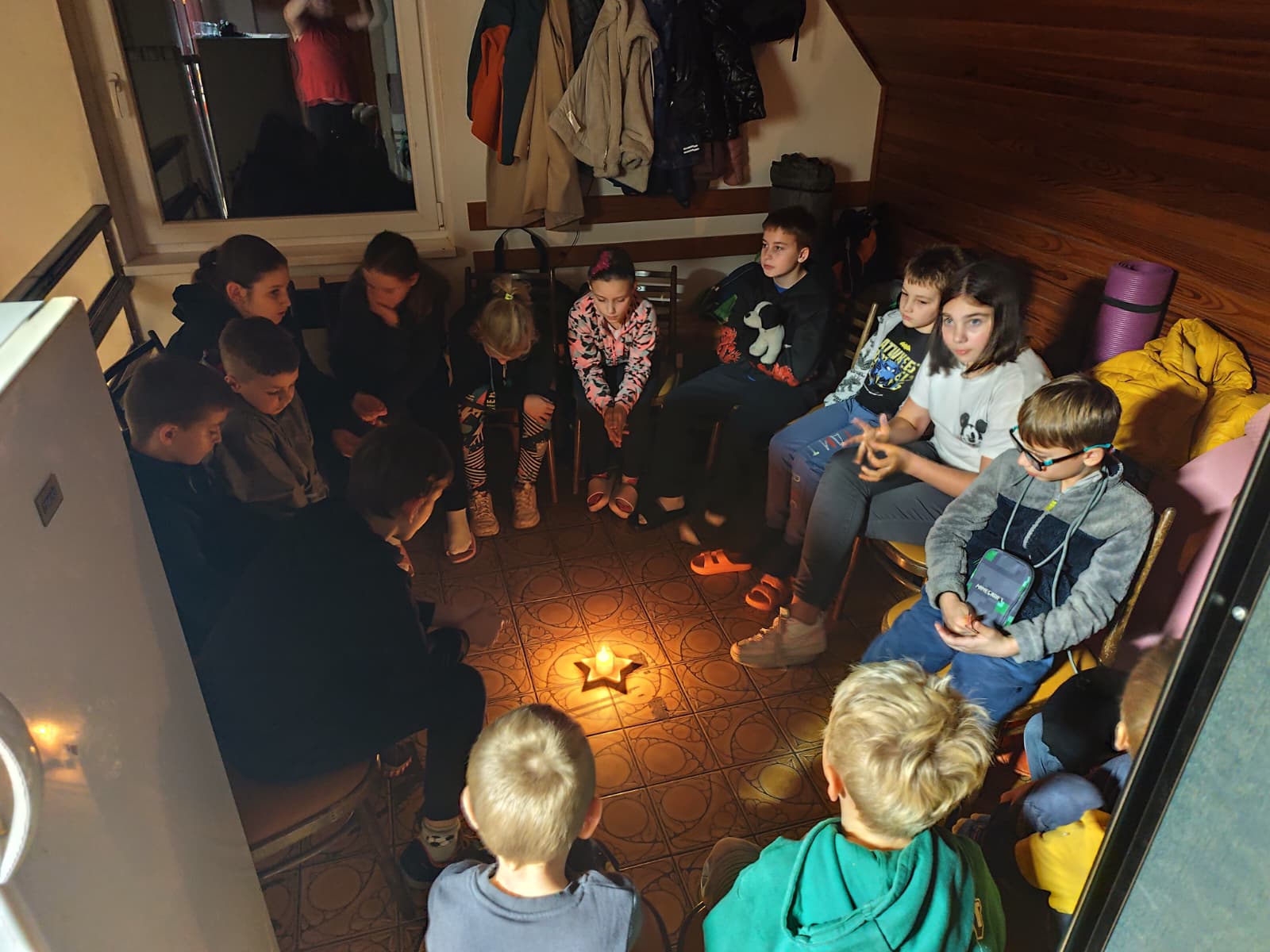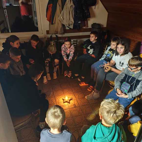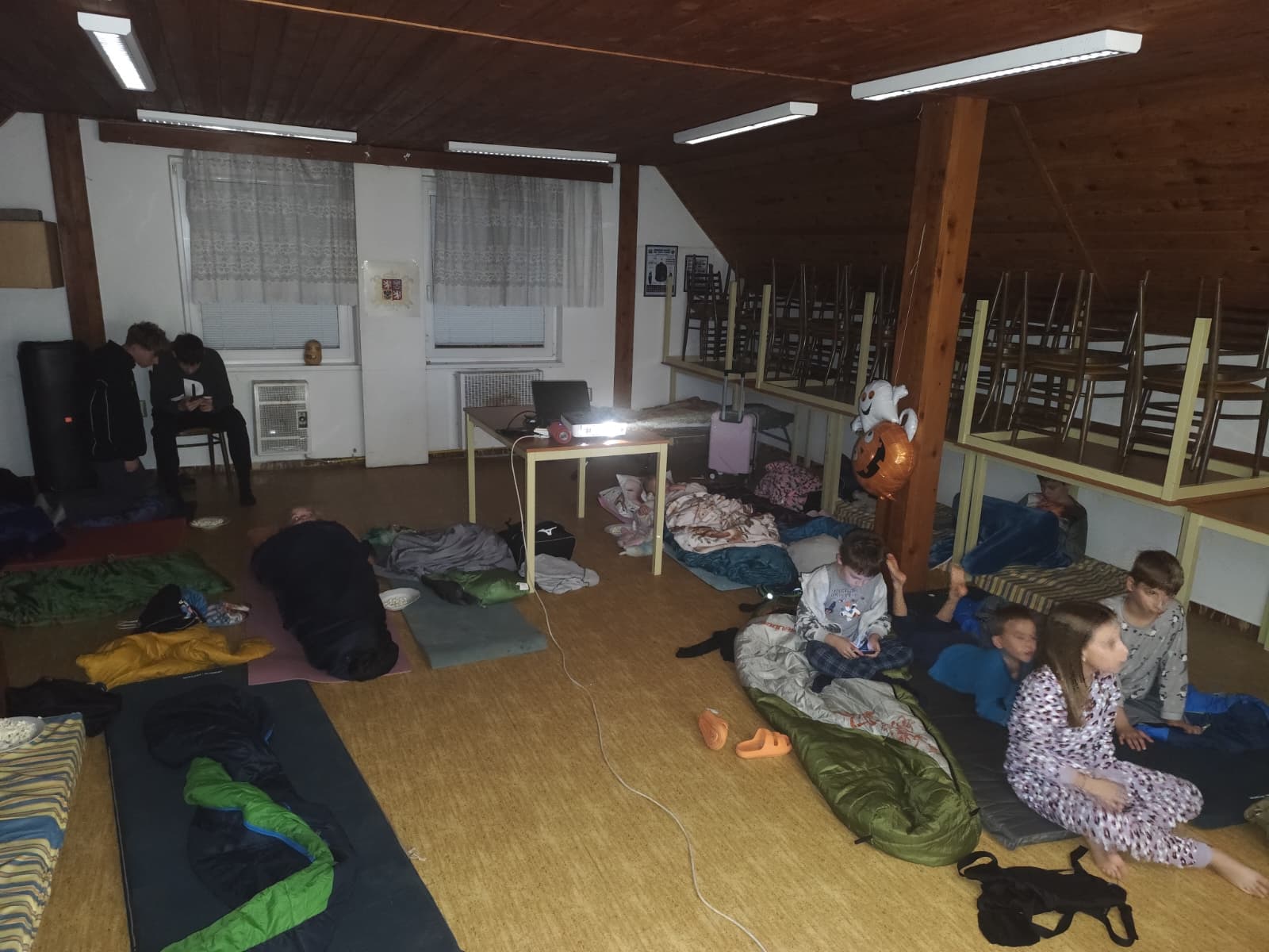 Následovaly zábavné aktivity 🎉, při kterých se děti nejen bavily, ale také utužovaly přátelství. Hrály se hry 🎲, soutěžilo se 🦸 a nechyběl ani tanec 💃 pod blikajícími světýlky 💡. Když se večer přehoupl do tmy 🌙, nastal čas na to nejdůležitější – vyprávění strašidelných příběhů 🤫. V šeru hasičárny se ozývaly tajemné hlasy, šustění a smích 😂, když si děti předávaly příběhy o strašidlech ze Starého Zubří. ⛰️