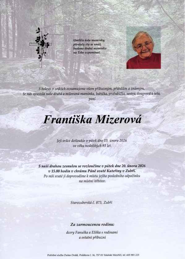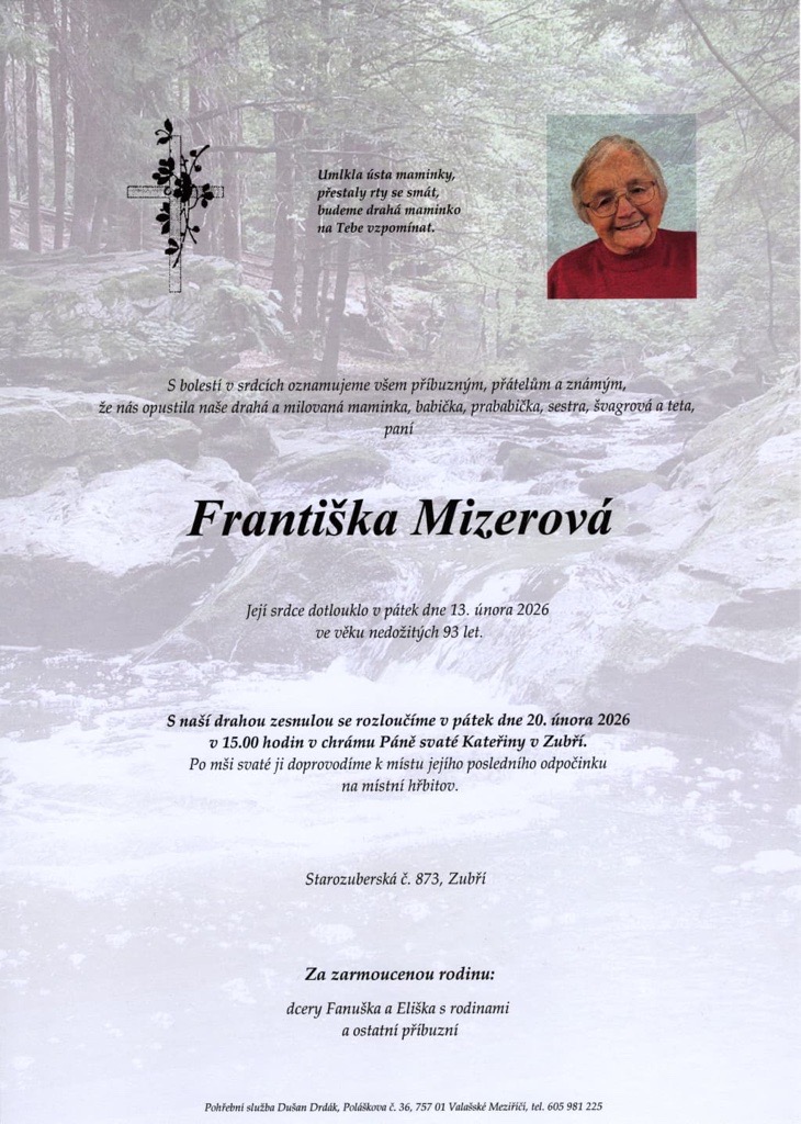 S hlubokým zármutkem jsme přijali zprávu, že nás ve věku nedožitých 93 let opustila paní Františka Mizerová, nejstarší členka Sboru dobrovolných hasičů Staré Zubří.