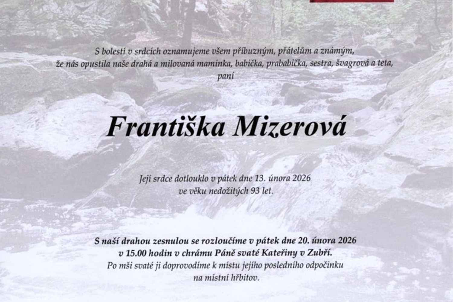 Poslední rozloučení se uskuteční v pátek 20. února 2026 v 15.00 hodin v chrámu Páně svaté Kateřiny v Zubří.